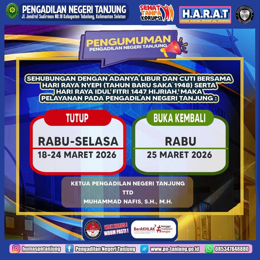 Sehubungan dengan adanya Libur dan Cuti Bersama Hari Raya Nyepi (Tahun Baru Saka 1948) serta Hari Raya Idul Fitri 1447 Hijriah, maka Pelayanan pada Pengadilan Negeri Tanjung: